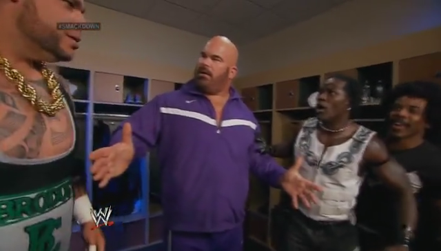 Brodus pushes Xavier into the lockers behind him. Tensai and R-Truth get in-between Brorus Clay and Xavier Woods before the could fight. Tensai asked what's going on and Clay walked off.